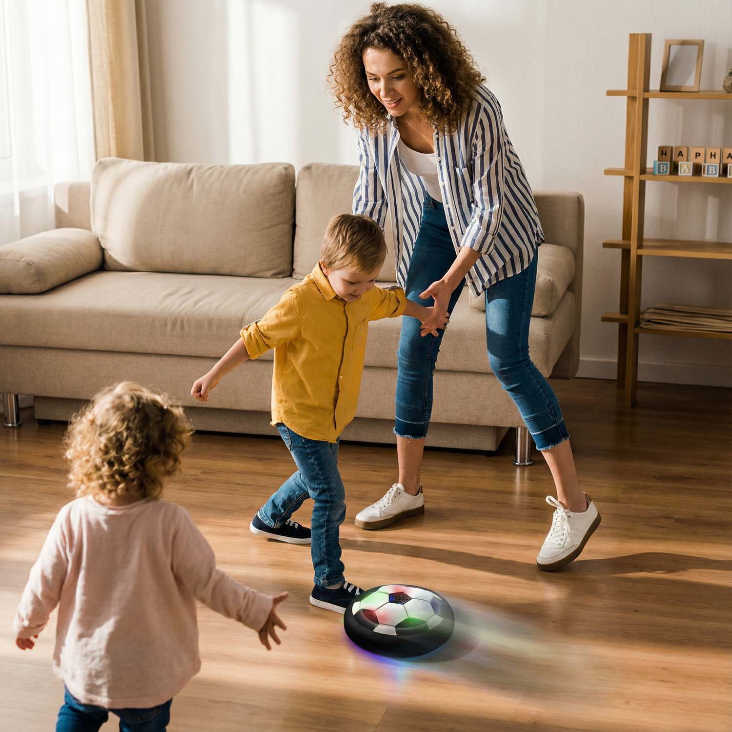 Po naładowaniu naciśnij przycisk zasilania – diody LED zaczną świecić, a piłka zacznie unosić się na poduszce powietrznej.